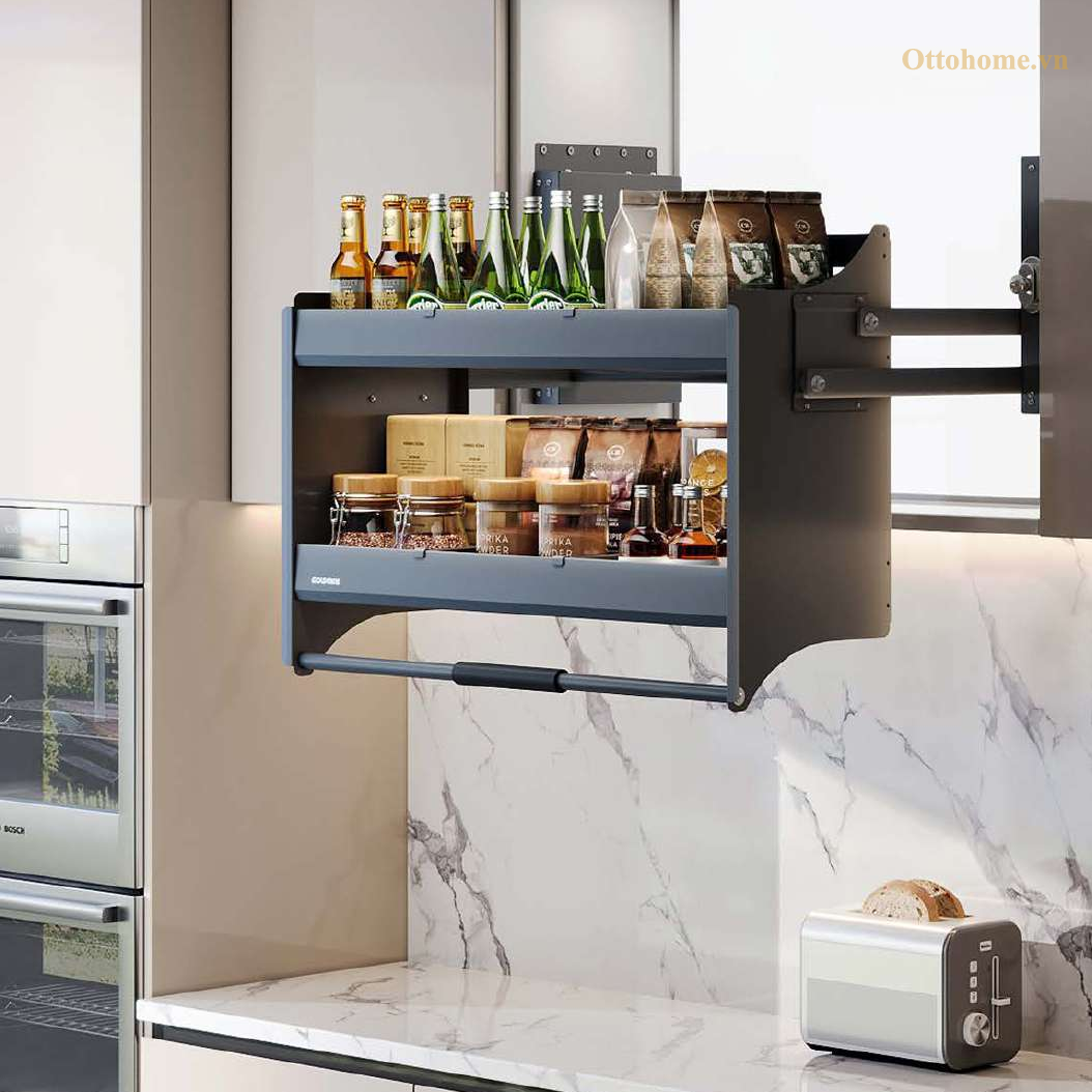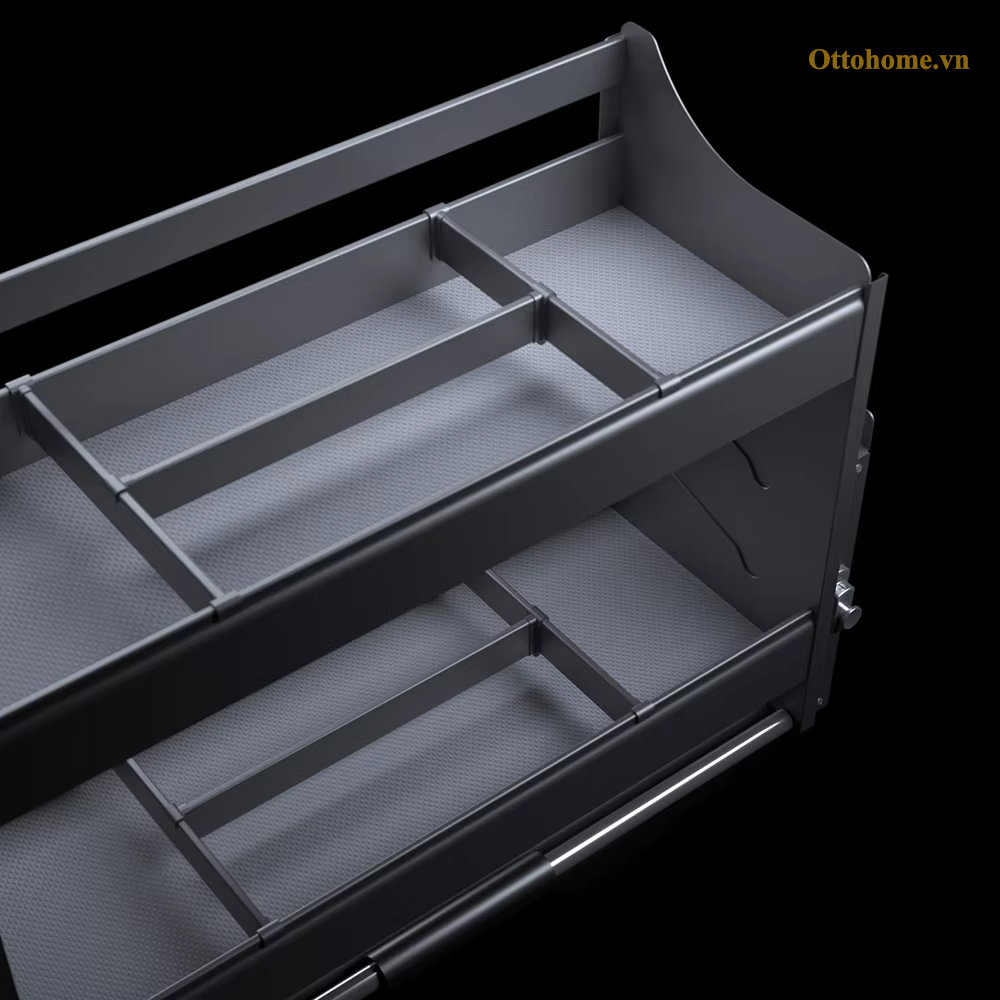 Các vách ngăn bên trong có thể di chuyển, giúp cố định chai lọ, hũ gia vị, ngăn chặn việc đổ vỡ khi nâng hạ. Phân loại lưu trữ 2 tầng khoa học gọn gàng, tăng diện tích chứa đồ gấp đôi so với kệ cố định.