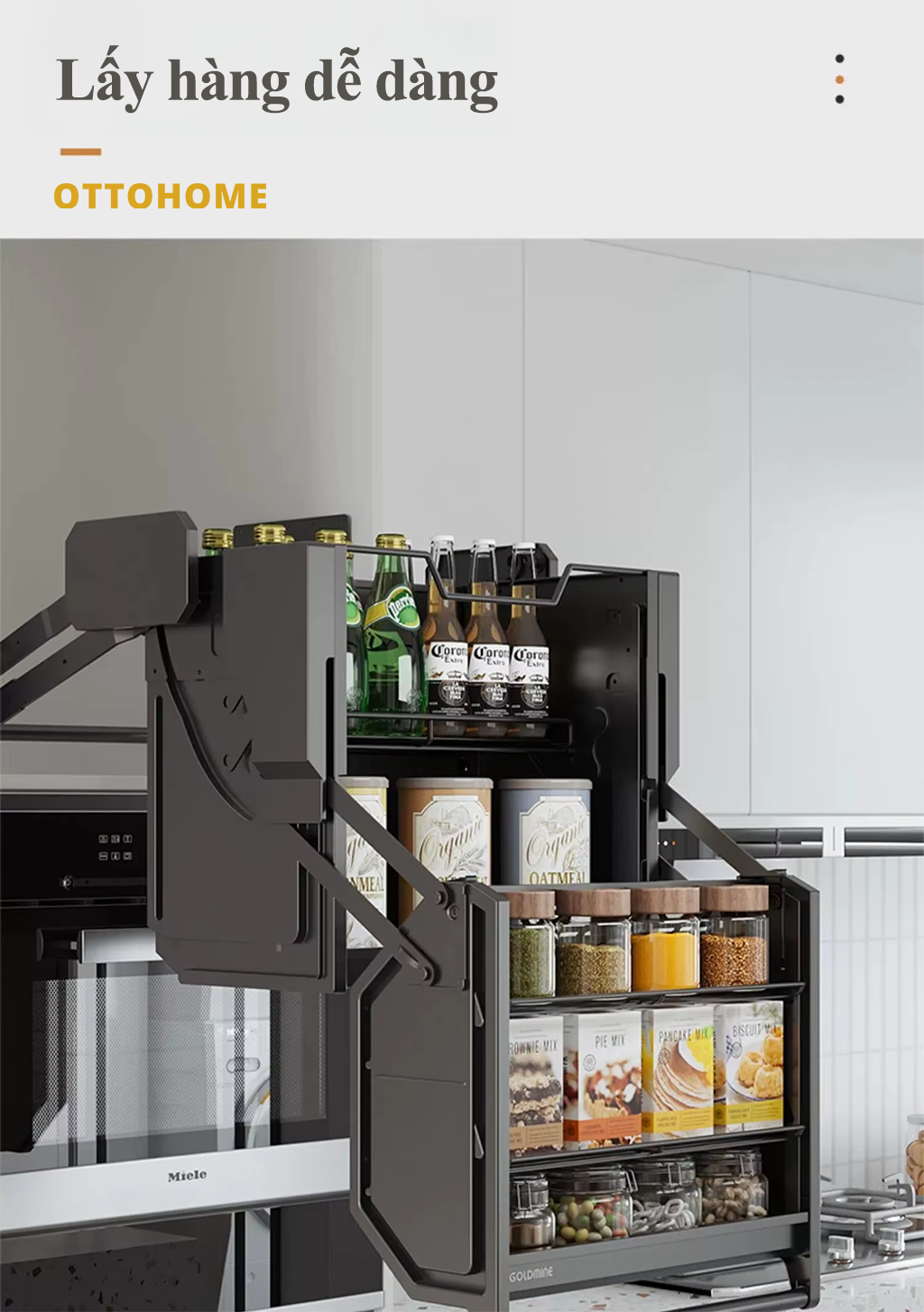 Tầng Dưới: Vị trí sử dụng thường xuyên cho các loại thực phẩm khô sử dụng hàng ngày. Khi kéo kệ xuống, tầng này sẽ nằm ngay sát tầm tay, giúp người nội trợ thao tác cực nhanh mà không cần rướn người.