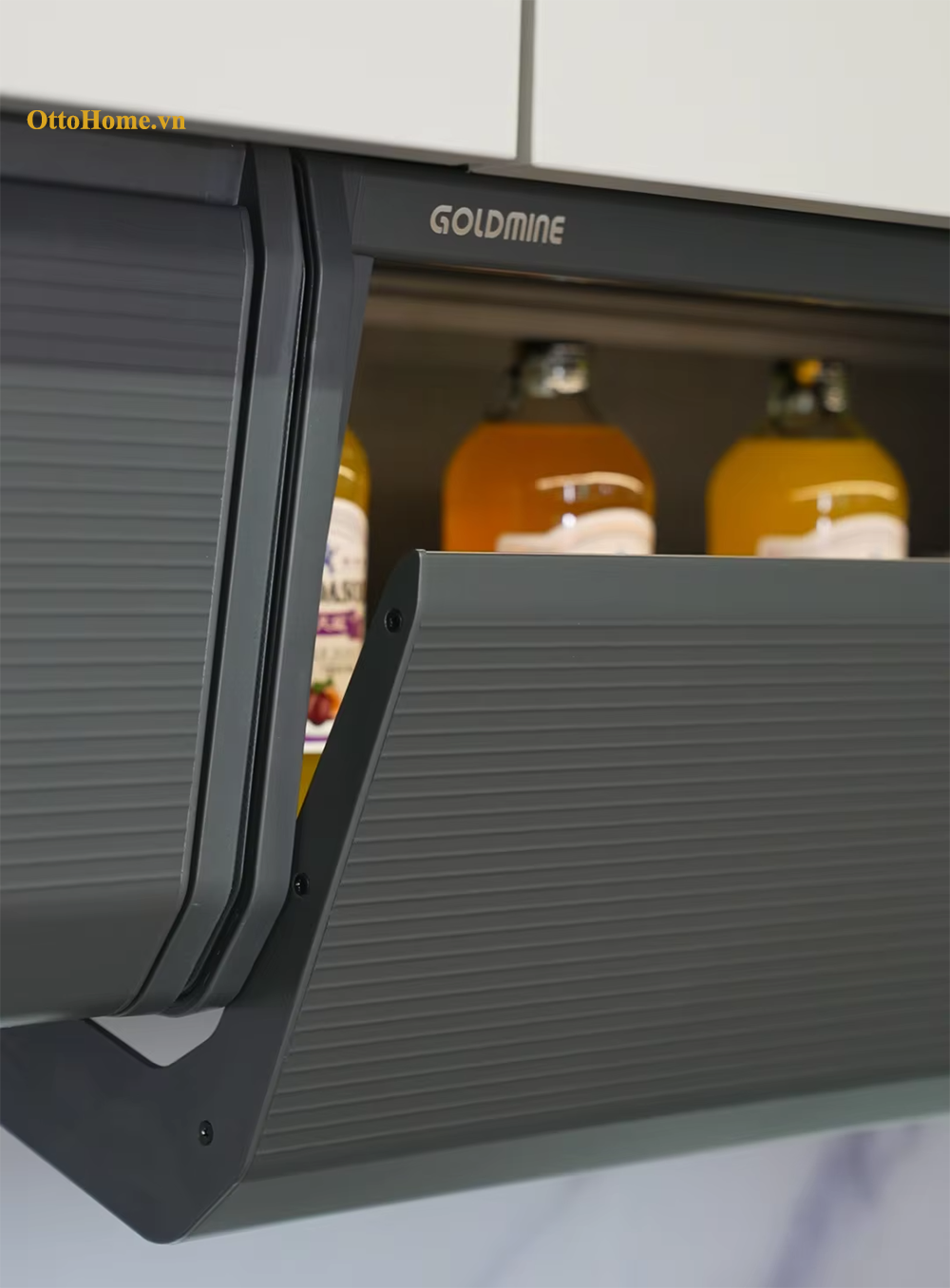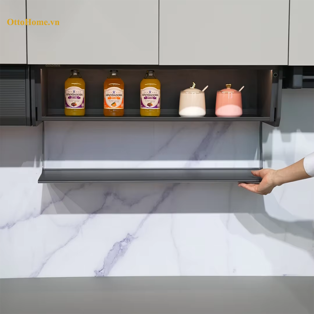 Kệ treo tủ trên thiết kế đóng mở Goldmine là giải pháp sắp xếp thời gian và không gian cho người nội trợ.