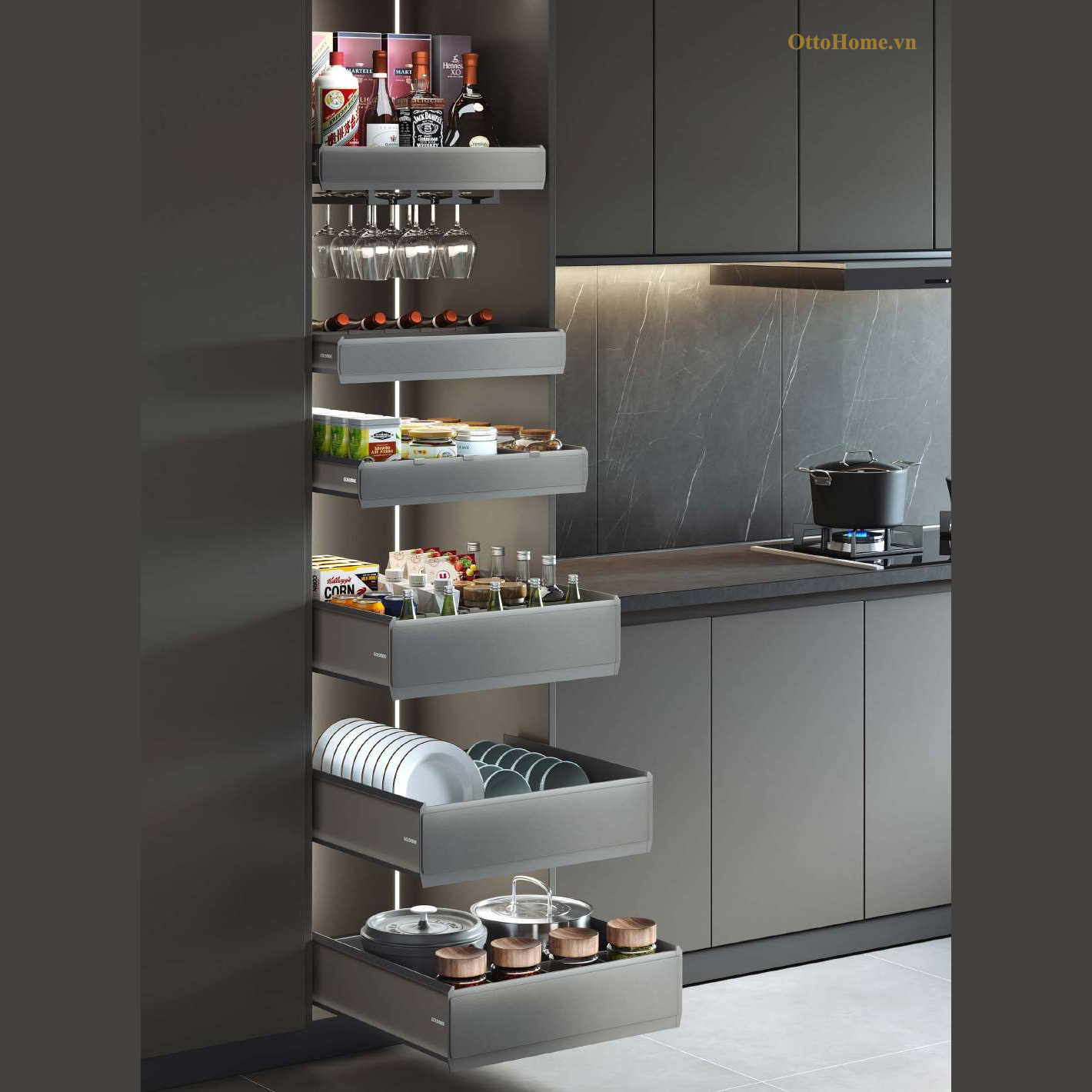 Mỗi ngăn kéo được thiết kế cho một mục đích cụ thể (đựng rượu, bát đĩa, xoong nồi, gia vị), tối ưu hóa công năng từng kệ giúp bếp luôn gọn gàng.